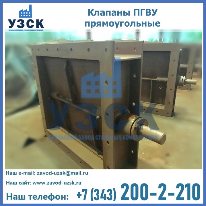 Прямоугольный клапан ПГВУ имеет прямоугольную или квадратную форму, по основному сечению конструкции, на которую устанавливается клапан. Для изготовления в Петропавловске применяются сталь или чугун, в зависимости от модели. Внутри клапана имеется запорный элемент, передвигающийся параллельно общему потоку движения среды. Шибер ПГВУ имеет такую же форму, как и основное сечение. Перемещение створки происходит благодаря возвратно-поступательным движениям.